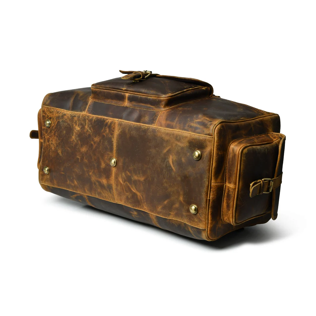 24-Inch Rugged Leather Weekend Duffle Bag, Multi-Pocket Holdall, Dark Cocoa Brown