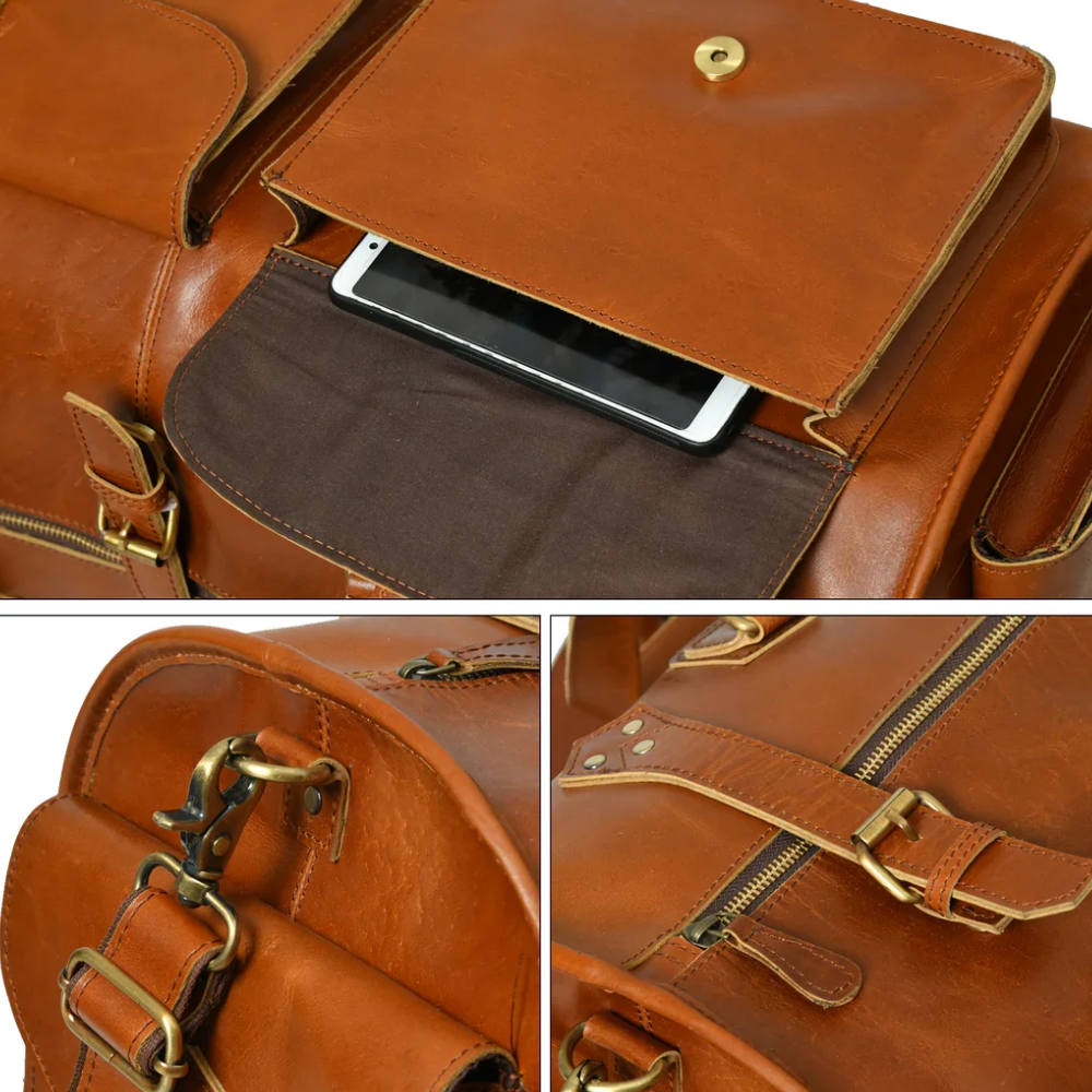 A cylindrical leather duffel bag designed for organized travel and storage. This piece features a structured body with multiple external utility pockets, making it suitable for carrying personal items for short trips or professional activities.