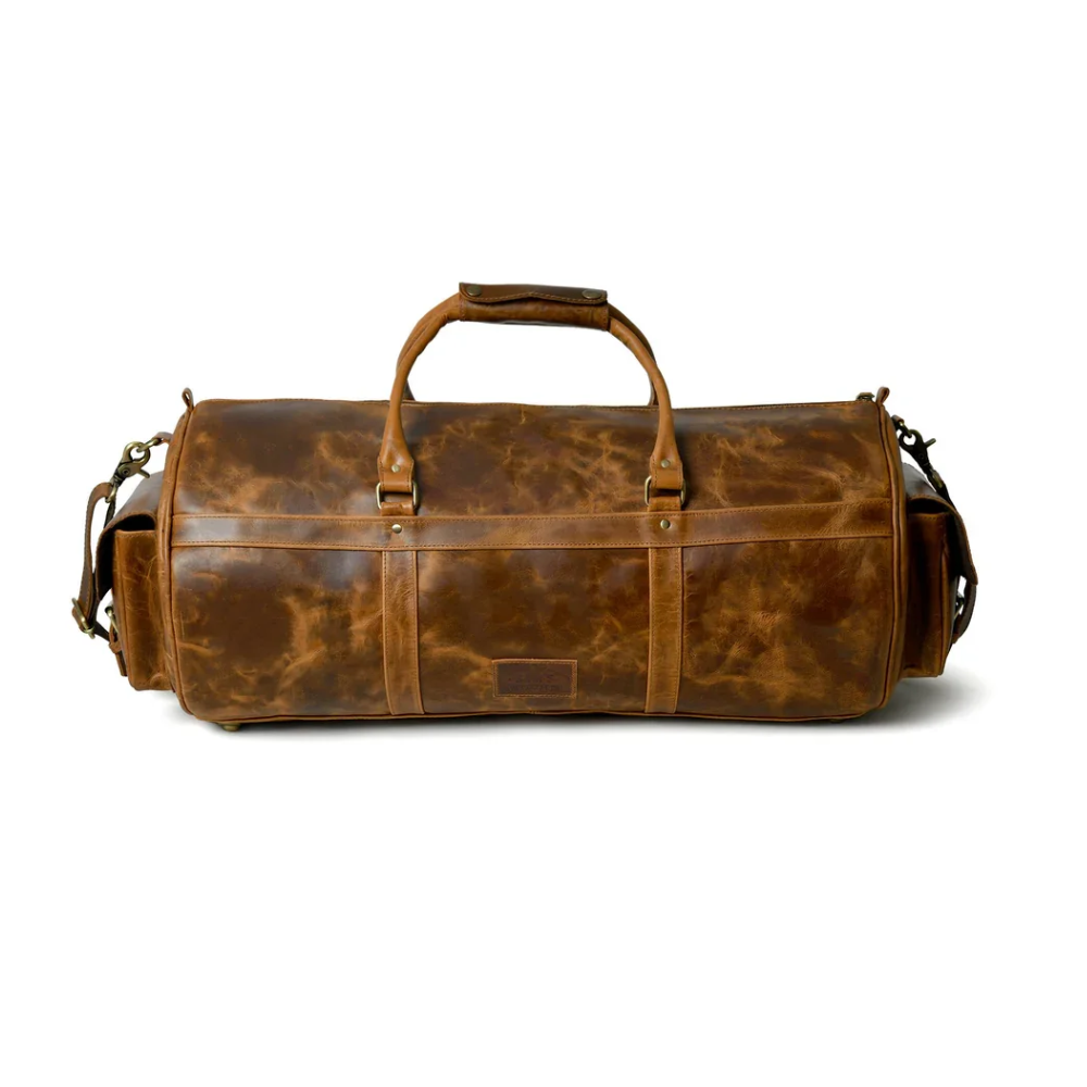 A cylindrical leather duffel bag designed for high-capacity storage and transport. This piece features a structured body with a reinforced base, making it suitable for carrying heavy items during travel or gym activities.