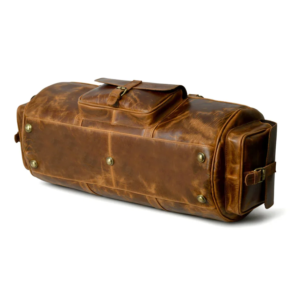 Flydigito Rugged Full-Grain Leather Overnight Bag, Vintage Brown Travel Duffle