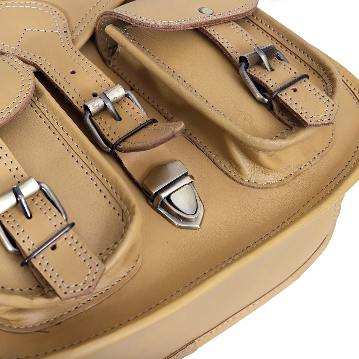 Handcrafted light tan leather messenger crossbody satchel for women with a flap‑over buckle closure, three front buckle pockets, a main compartment for essentials, and an adjustable leather shoulder strap for daily wear.