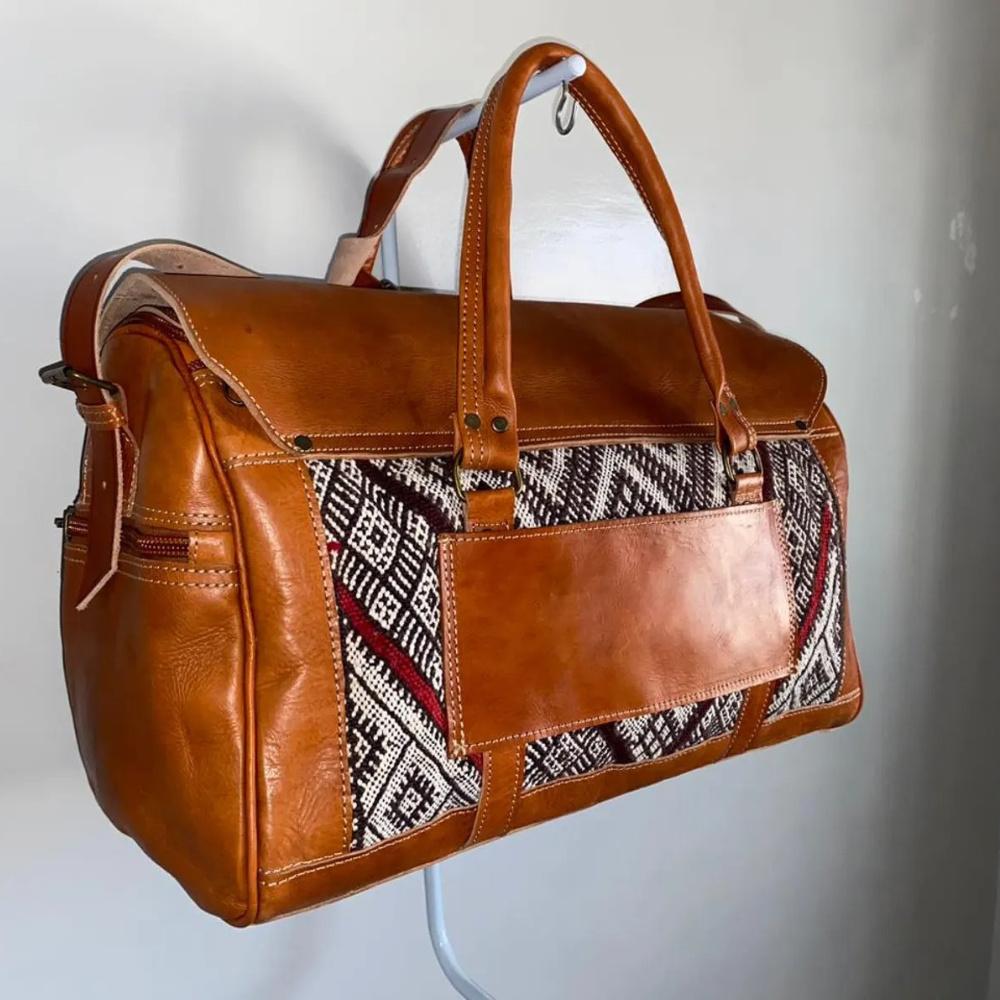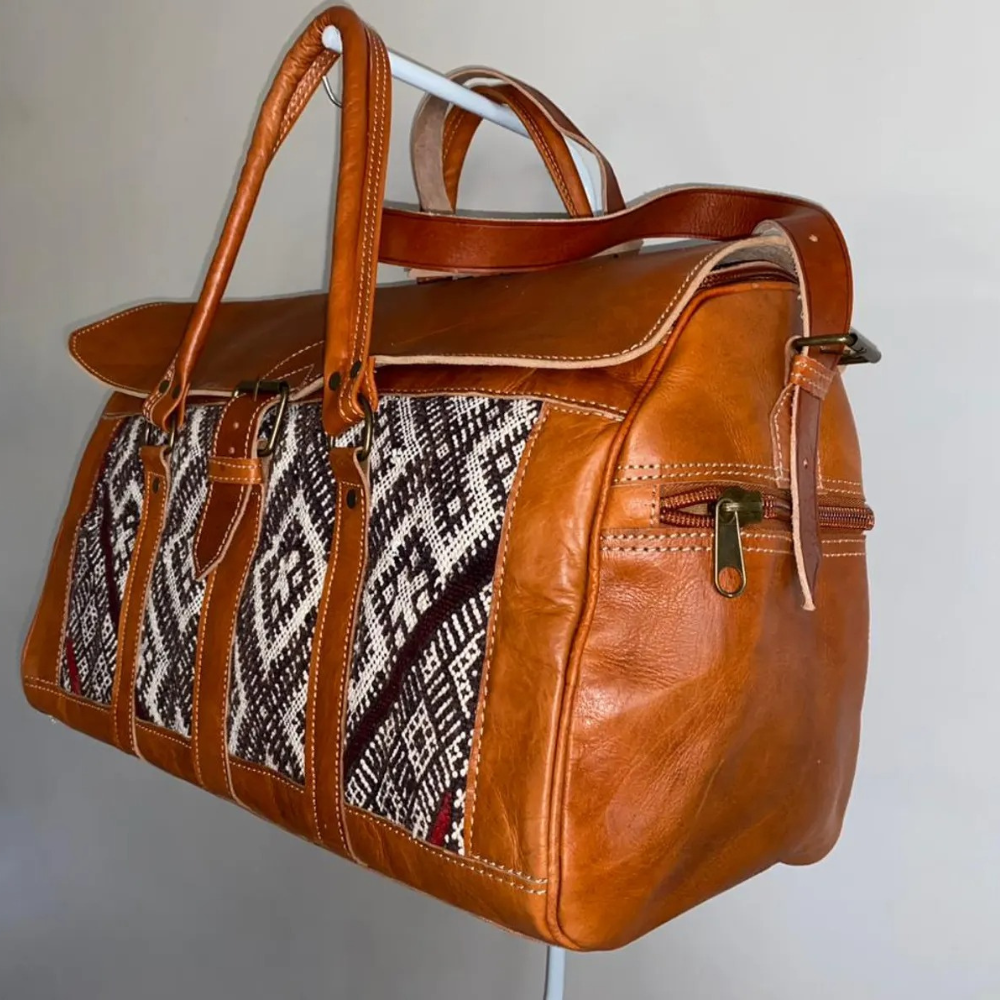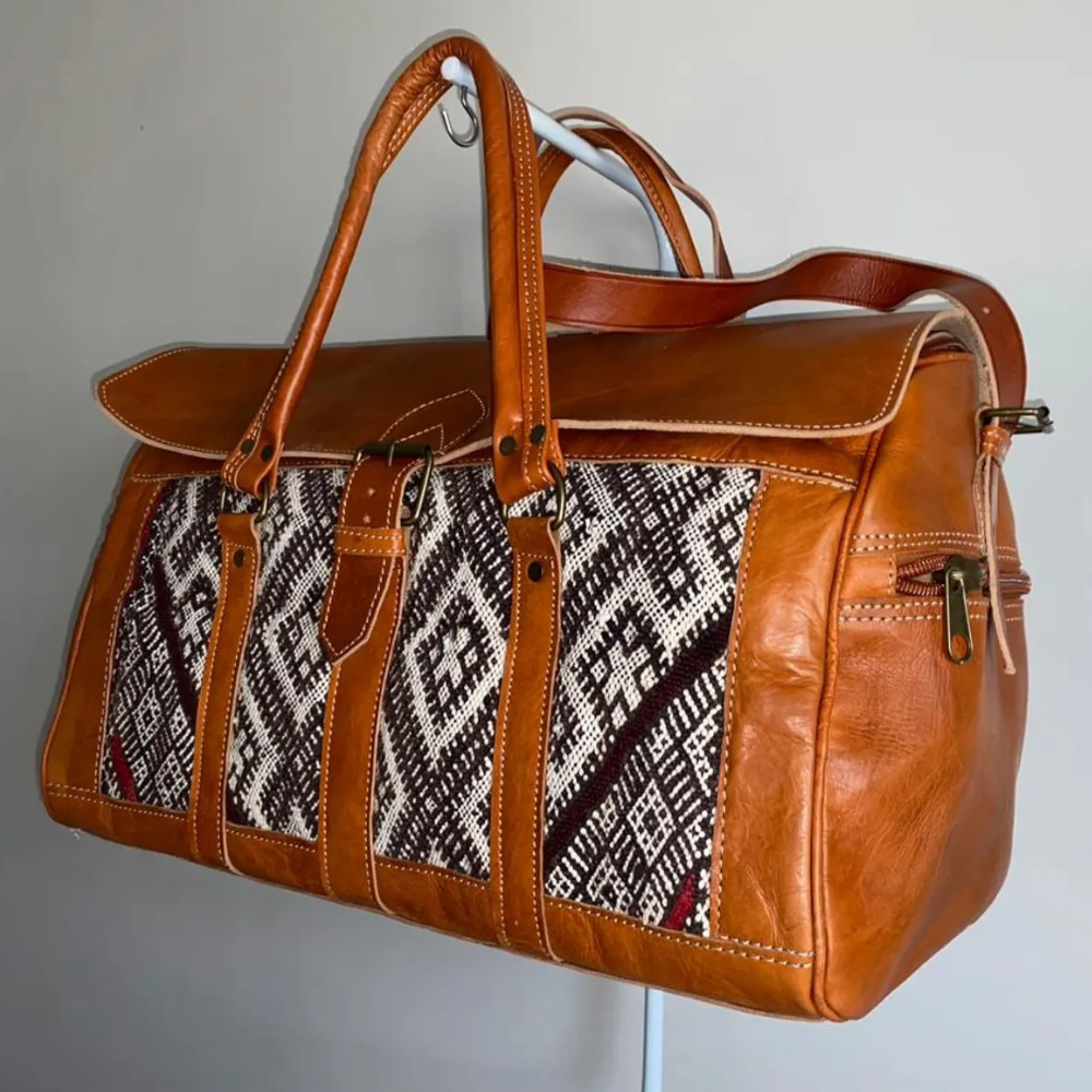 Moroccan Kilim Leather Duffel Bag – Tan Diamond Pattern – 50 cm
